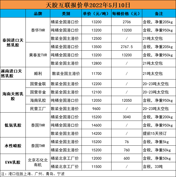 黄春发涨价300元/吨!天然乳胶现货价格(2022.5.10)