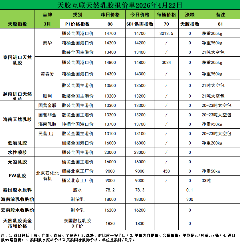 暂无变化!天然乳胶现货价格(2026.04.22)