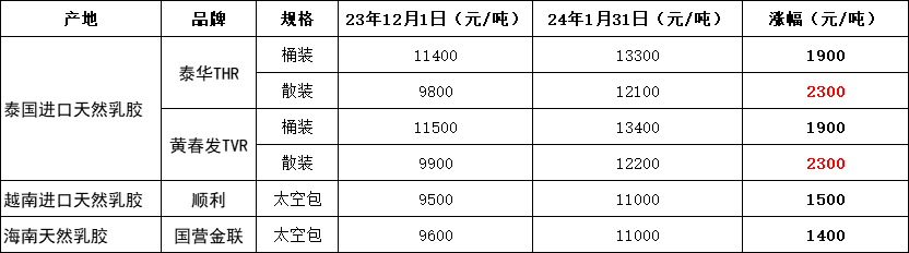 其实,相比前几年,今年节前行情明显偏强,我们昨天也分析了,1月份天然乳胶现货的价格涨幅在600-1000元/吨之间,这个只是1月份的涨幅,光1月份大家已经“吃到了”这一波涨幅。如果时间往回倒到2023年12月份。2023年12月份和2024年1月份加起来,这两个月的涨幅如下: