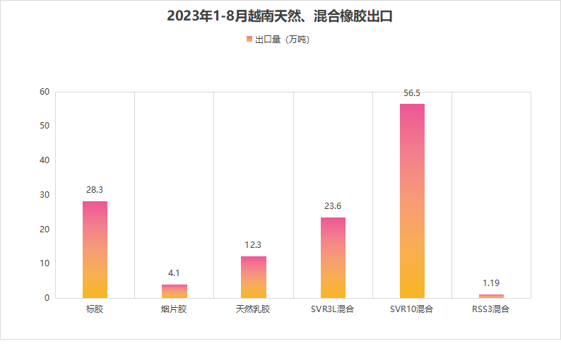 橡胶期货目前在14000附近震荡。天然乳胶现货节前价格变化不大:泰华THR桶装11300元/吨,黄春发桶装11400元/吨;泰华THR散装(太空包)9900元/吨,黄春发散装(太空包)10000元/吨。2023年8月越南出口天然橡胶7.4万吨。今年前8个月合计45万吨,较去年的52万吨下降13.5%。其中,标胶出口28.3万吨,同比降8%;烟片胶出口4.1万吨,同比降13%;乳胶出口12.3万吨,同比降24%。2023年8月越南出口混合橡胶14.2万吨,今年前8个月合计81万吨,较去年的67.7万吨增加20%。其中,SVR3L混合出口23.6万吨,同比增47%;SVR10混合出口56.5万吨,同比增11%;RSS3混合出口1.19万吨,同比增13%。2023年8月越南天然橡胶出口中国2.8万吨,今年前8个月合计12.2万吨,较去年的10.3万吨增加18%。今年1-8月,越南混合橡胶出口中国合计80.8万吨,较去年的67.7万吨增加19%。其中,SVR3L混合出口23.4万吨,同比增46%;SVR10混合出口56.5万吨,同比增11%;RSS3混合出口1.07万吨,同比增7%。综合来看,1-8月,越南天然橡胶、混合胶合计出口126万吨,较去年的119.7万吨增加5.3%;合计出口中国93万吨,较去年的78万吨增加19%。从数据上来看,越南今年整体出口有所增长,不过8月份出口有所下降,但8月份天然乳胶出口出现增长,2.9万吨,是越南今年出口的高位。8月份越南天然乳胶出口增长主要原因在于8月属于旺季,供应充足,而且8月份越南天然乳胶价格比较地,整个月平均价格在8000元/吨左右,性价比较高,所以国内贸易商比较倾向于越南胶进口。而越南天然乳胶主要出口到国内。以上纯属个人分析,不构成投资建议,投资者据此投资,投资风险自我承担。
