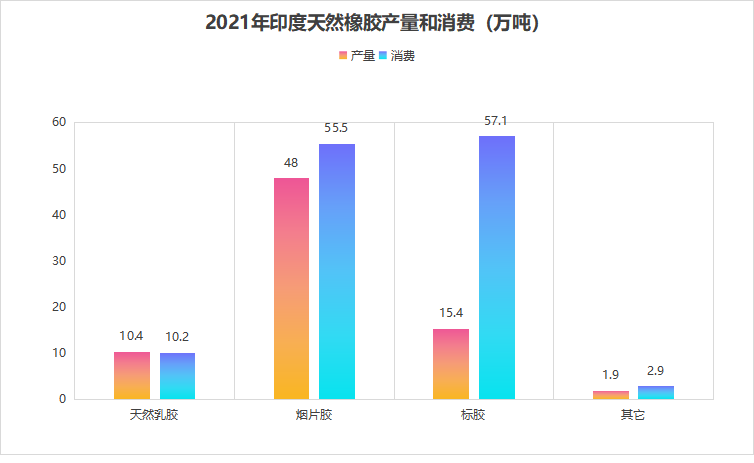 2021年印度天然橡胶产量同比增10.5%至75.7万吨,去年同期为68.5万吨。其中,天然乳胶产量同比增26.8%至10.4万吨;烟片胶产量同比增6%至48万吨;标胶产量同比增18.5%至15.4万吨;其他产量同比降5%至1.9万吨。