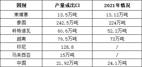 2022年上半年柬埔寨天然橡胶出口13.5万吨,同比去年增长17.11;2022年上半年泰国天然橡胶出口242.5万吨,同比增长5%;2022年上半年科特迪瓦橡胶出口60.6万吨,同比增长16.1%;2022年上半年越南天然橡胶79.5万吨,同比增长8.9%;2022年1-5月印尼天然橡胶产量128.8,通比增长1%;2022年1-5月,马来西亚天然橡胶15万吨,同比下降17.61%;2022年上半年中国天然橡胶产量21.92万吨,同比减少2.18万吨。